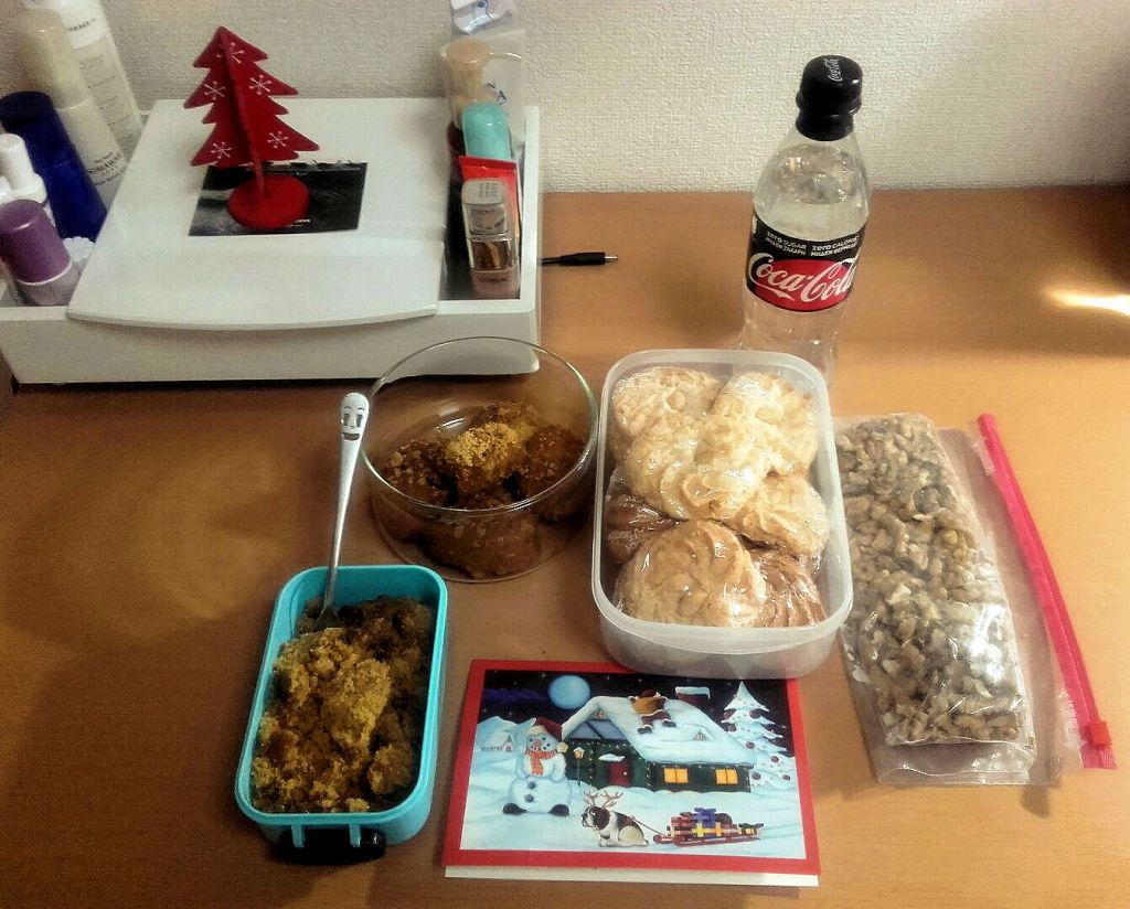 Finally, my mom’s parcel with homemade Christmas sweets arrived (late and with 5/10 surviving ‘melomakarona’). **The coca cola bottle does not contain water – ‘tsipouro’ 38%vol**