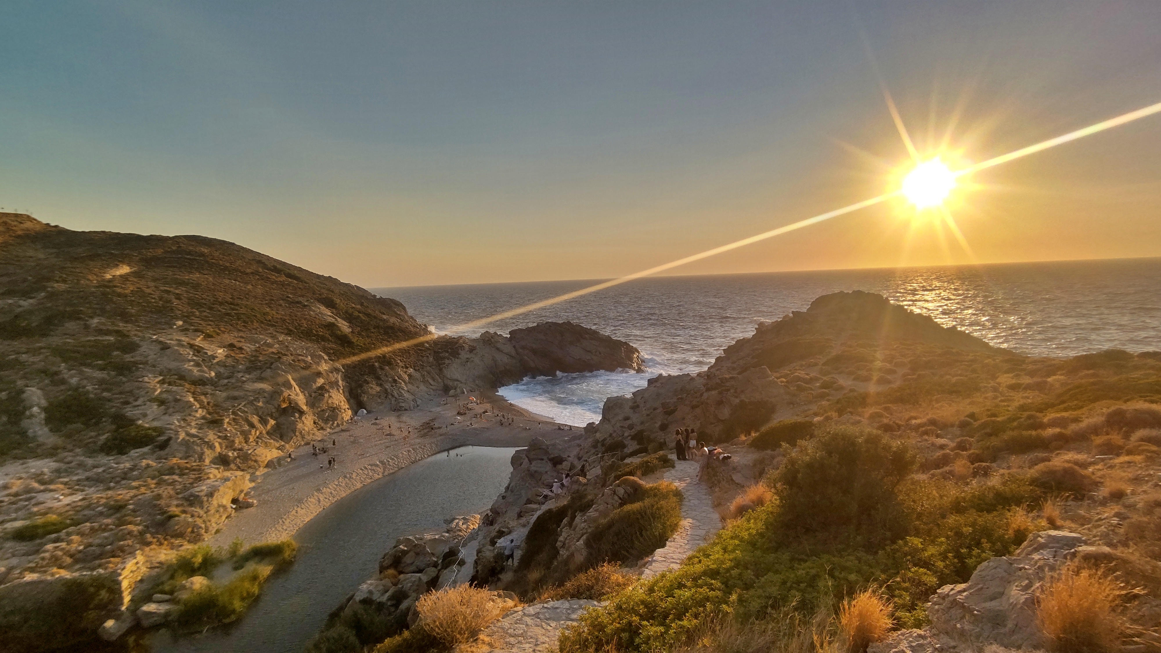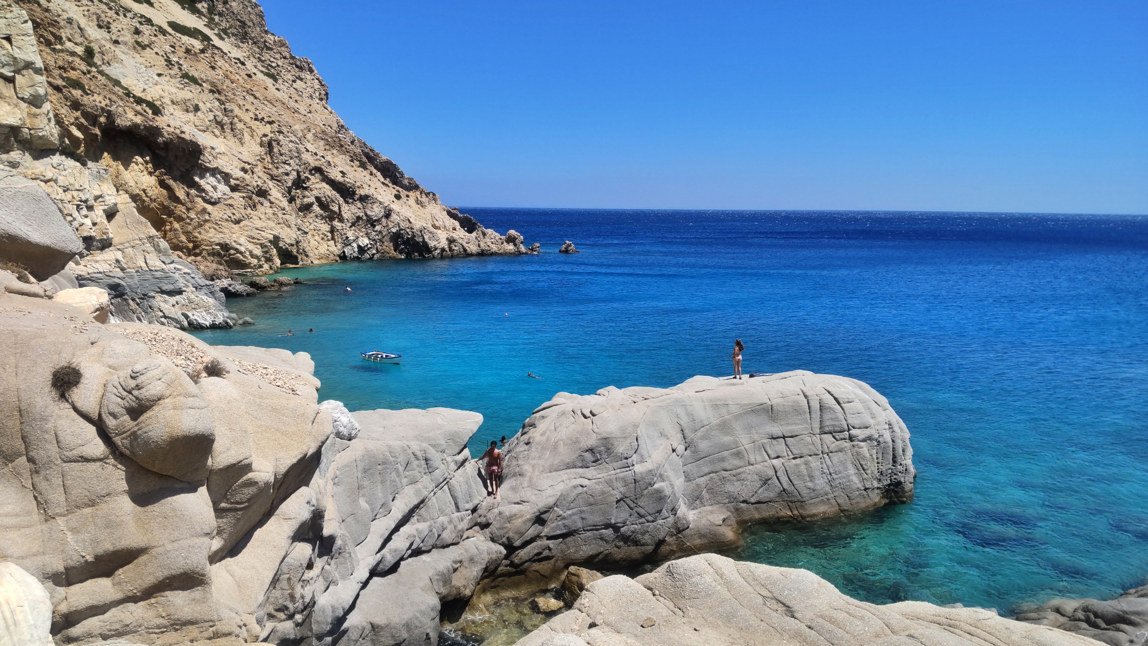 The silhouette of Fournoi Korseon island guts you at sunset. Every night, we’d vow to take the ferry over the next day. Every morning (noon, more accurately) —with coffee clutched, fresh beers chilling at the cooler box— we’d chase new beaches, boat long gone. Driving clockwise, you will eventually reach Seychelles, a beach with turquoise waters, a miraculous consequence of a tunnel being constructed on the road above. One can either park on the road and carefully navigate the fallen rocks (there’s a slippery rock and a support rope just before reaching the water) or you can ride the hourly boat from nearby Magganitis village. There’s even a makeshift bar offering cocktails, if you forgot to take provisions. On the way back, you absolutely have to stop by at Magganitis port for drinks and bites with a view.