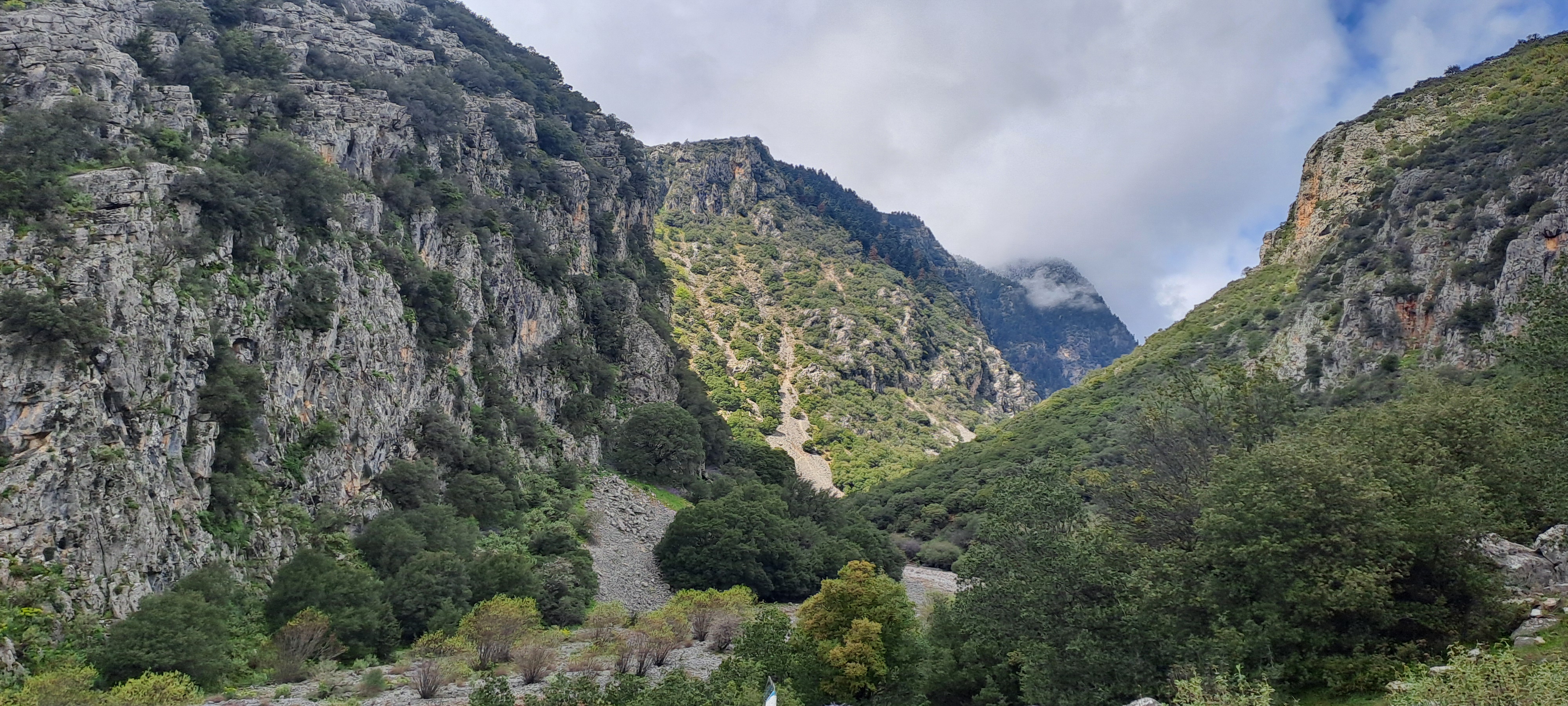 We followed the path to the left once more and eventually saw Karagiannis path, a harder trail at the north-western side of the peak that includes scrambling and exposed sections) and finally the wall (Orthoplagia) of Sykia, the tallest in the Balkans with 1100 meters height. Climbing it is a great feat for all Greek climbers, and usually takes two days for less experienced climbers. That last part is rocky and rough, and quite boring also, so prepare your knees and your nerves. As the trail levelled, we caught a first glimpse of the village of Sykia, our final destination for grilled dishes and well-deserved rest. At the entrance of the village, a stream and a spring welcome you to wash your tired feet. Don’t miss the opportunity to try the lamb chops at the tavern, I vouch for them.
