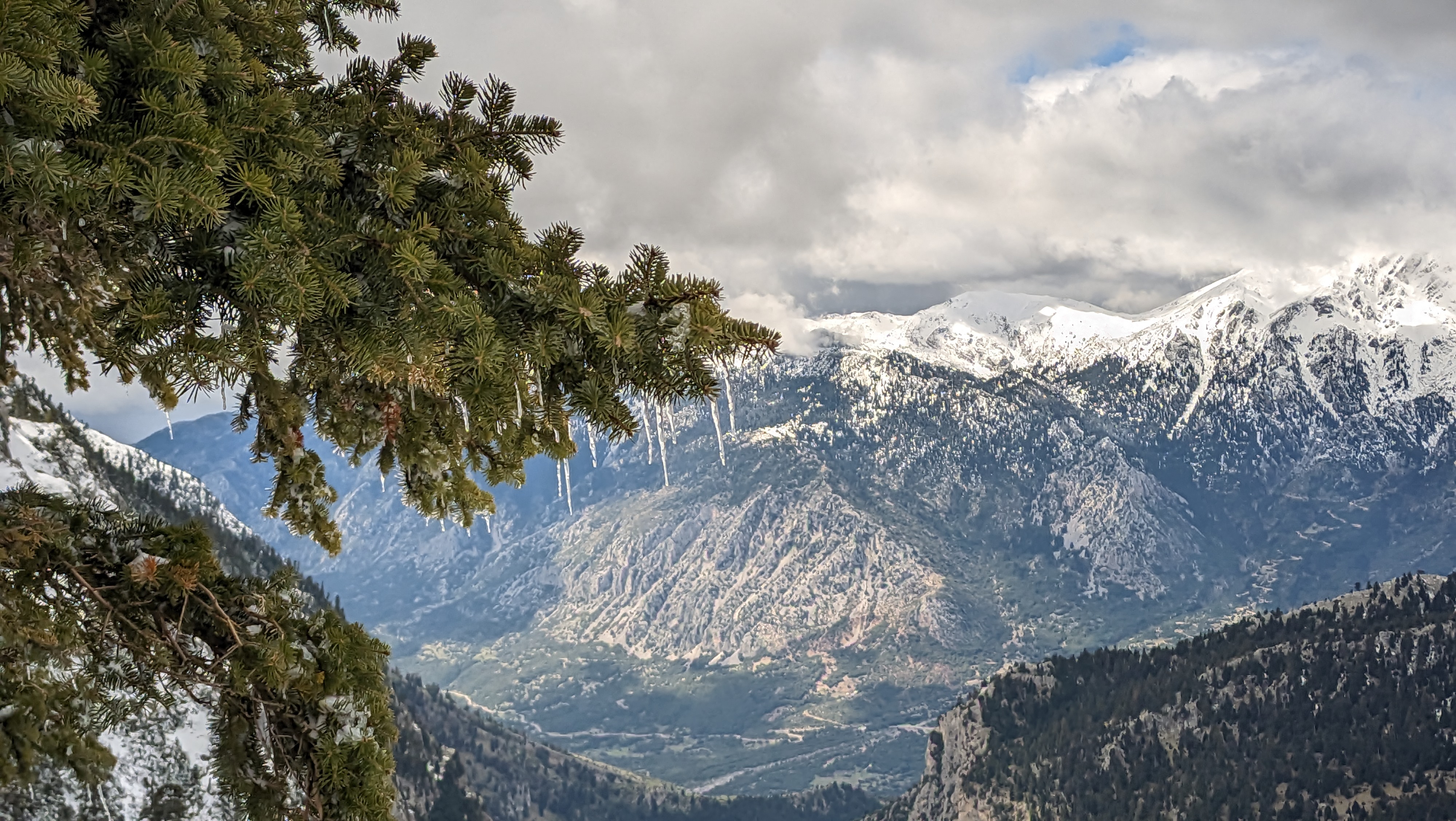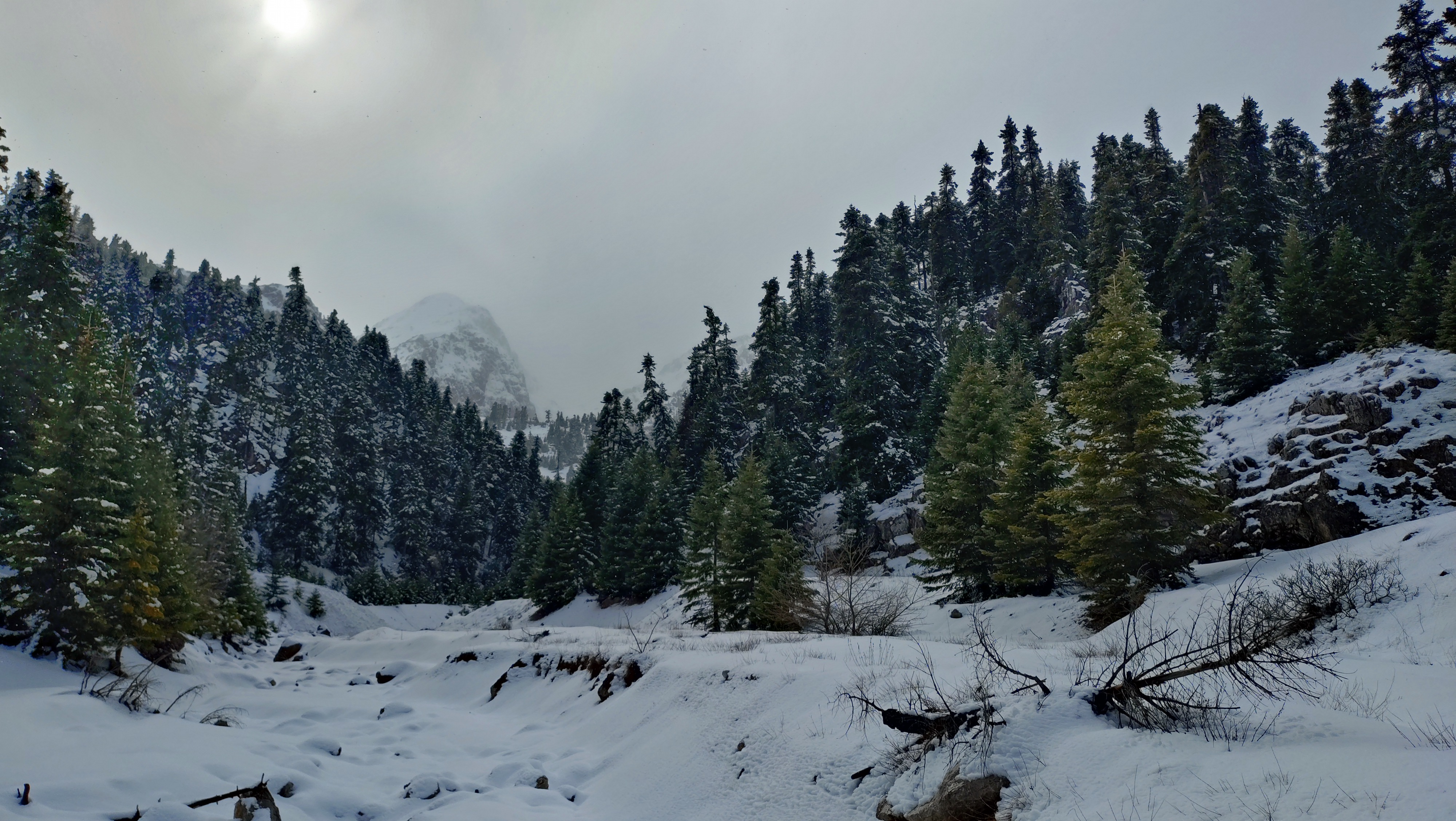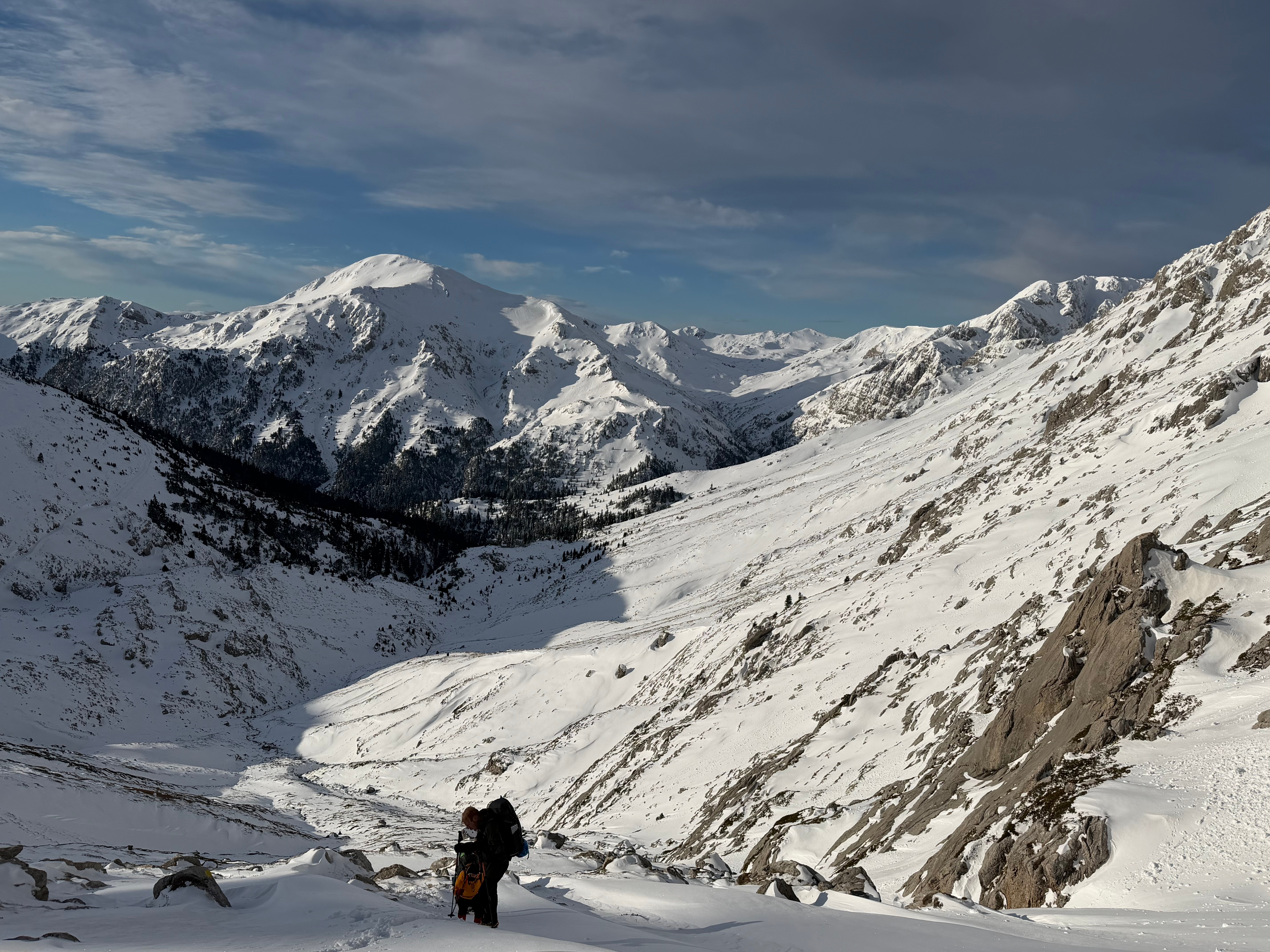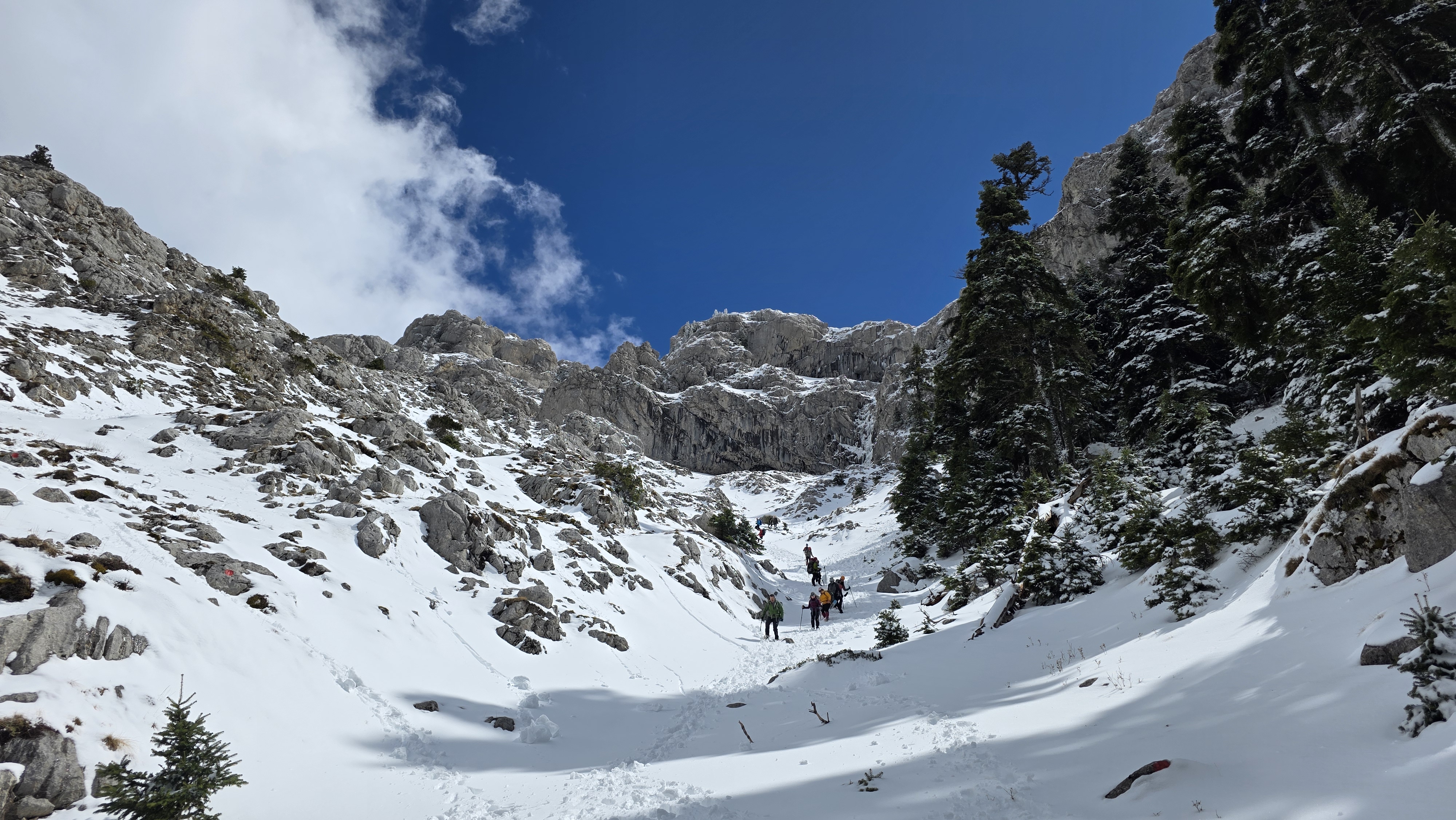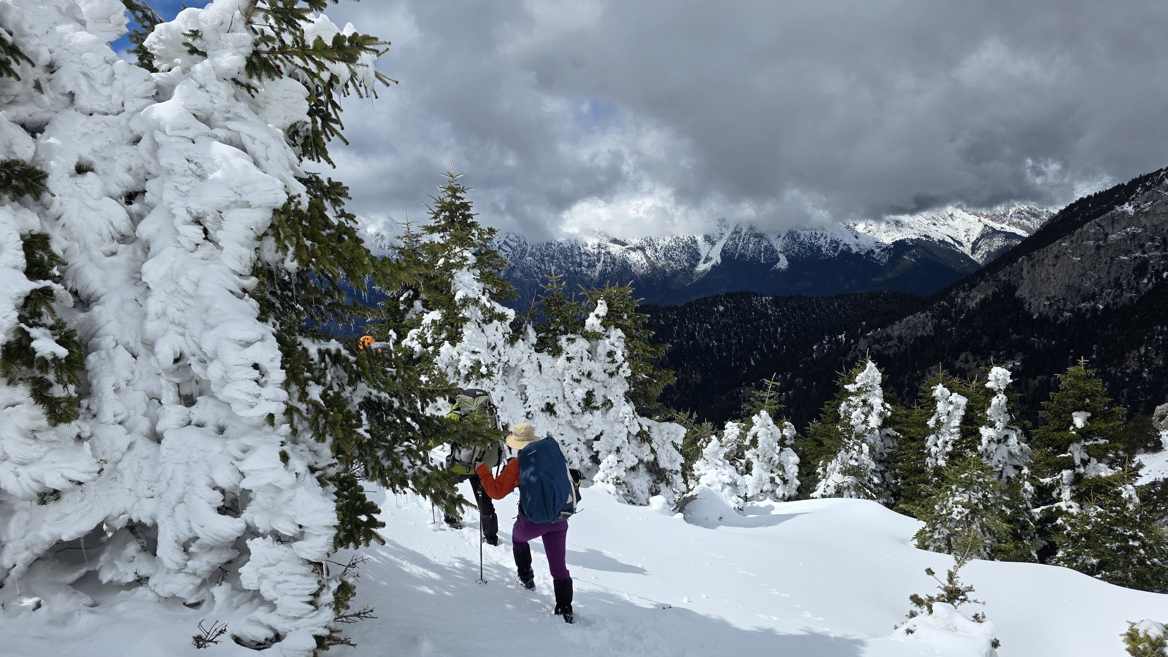 Once at the peak, the landscape steals your breath in a second. Megas Kampos of Vardousia to the west, Oiti to the east. It was a miracle that it was not windy at all, we were so lucky. On the way down, we turned left again, towards Vathia Lakka. Although we decided to take off the crampons there, it proved to be an unwise choice. Two days ago, it snowed a lot, and trail traversing towards Kedro was on slopes heavy with fresh snow. We put crampons back on and continued careful, especially at the rapidly descending couloir just before entering the proper forest again.