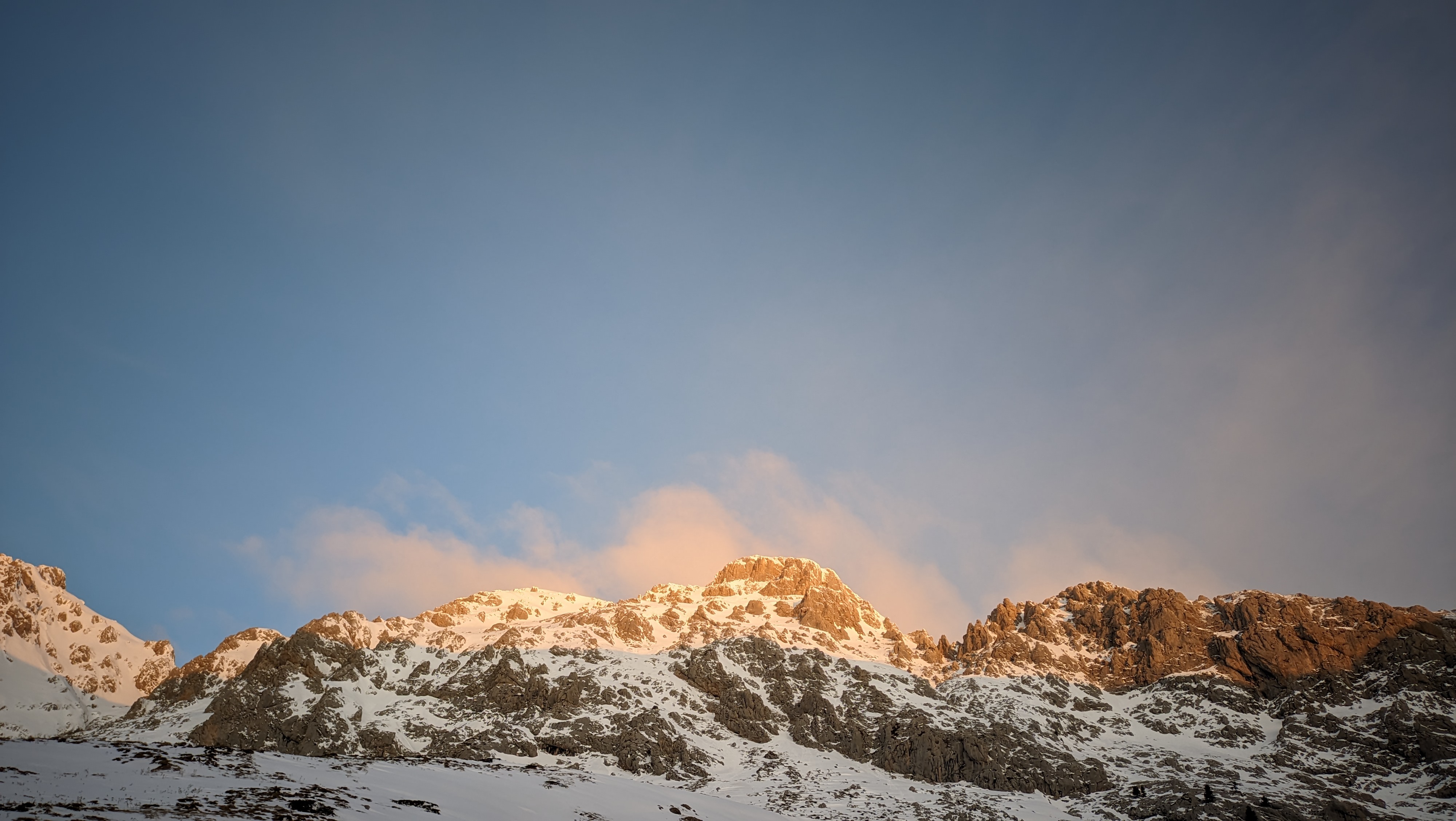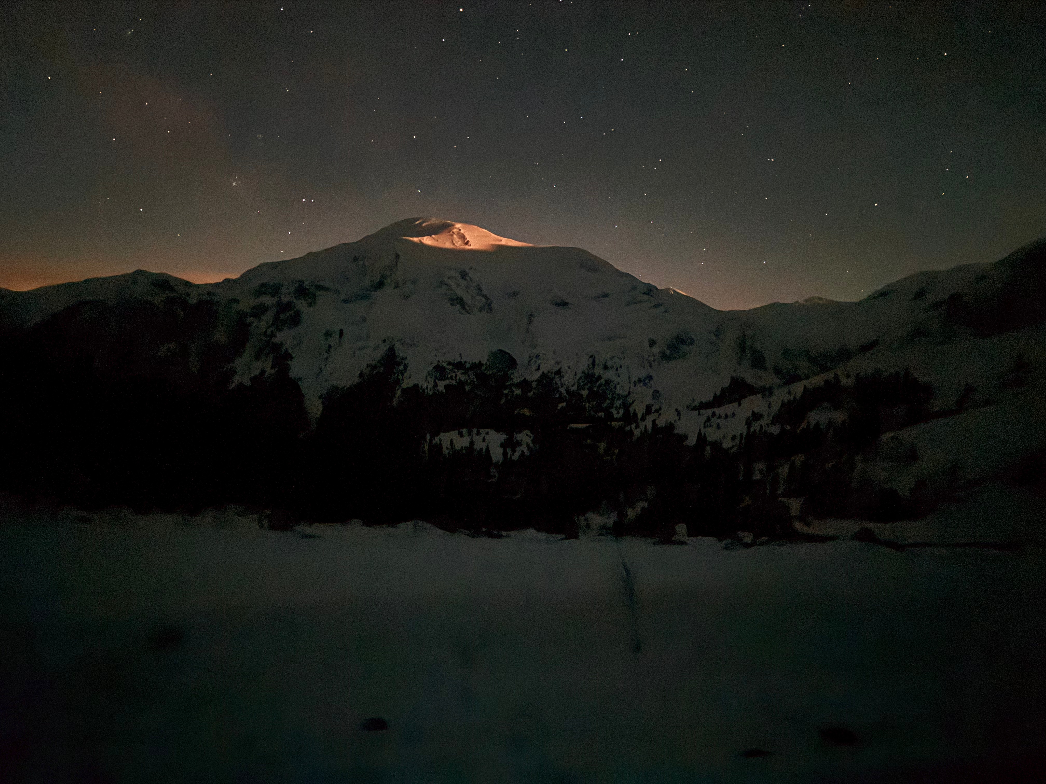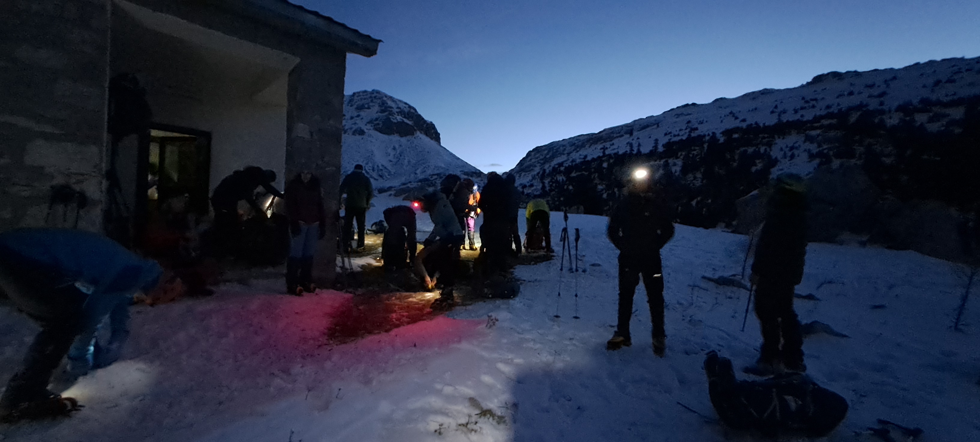 Although we planned for a few of us to sleep outside in tents, we somehow managed to cramp ourselves inside the hut, transforming benches into beds. Running water was available and we cooked dinner at the well-equipped kitchen. The plan was to wake up early the next morning, before sunrise, in order to avoid soupy snow. This plan ended up being a complete sham; it was the Sunday of the daylight-saving time switch, and the alarm clocks of half of our group decided to ring one hour earlier, causing everyone to wake up begrudgingly. We prepared our headlights, and started going uphill, from the backside of the Pyramid.