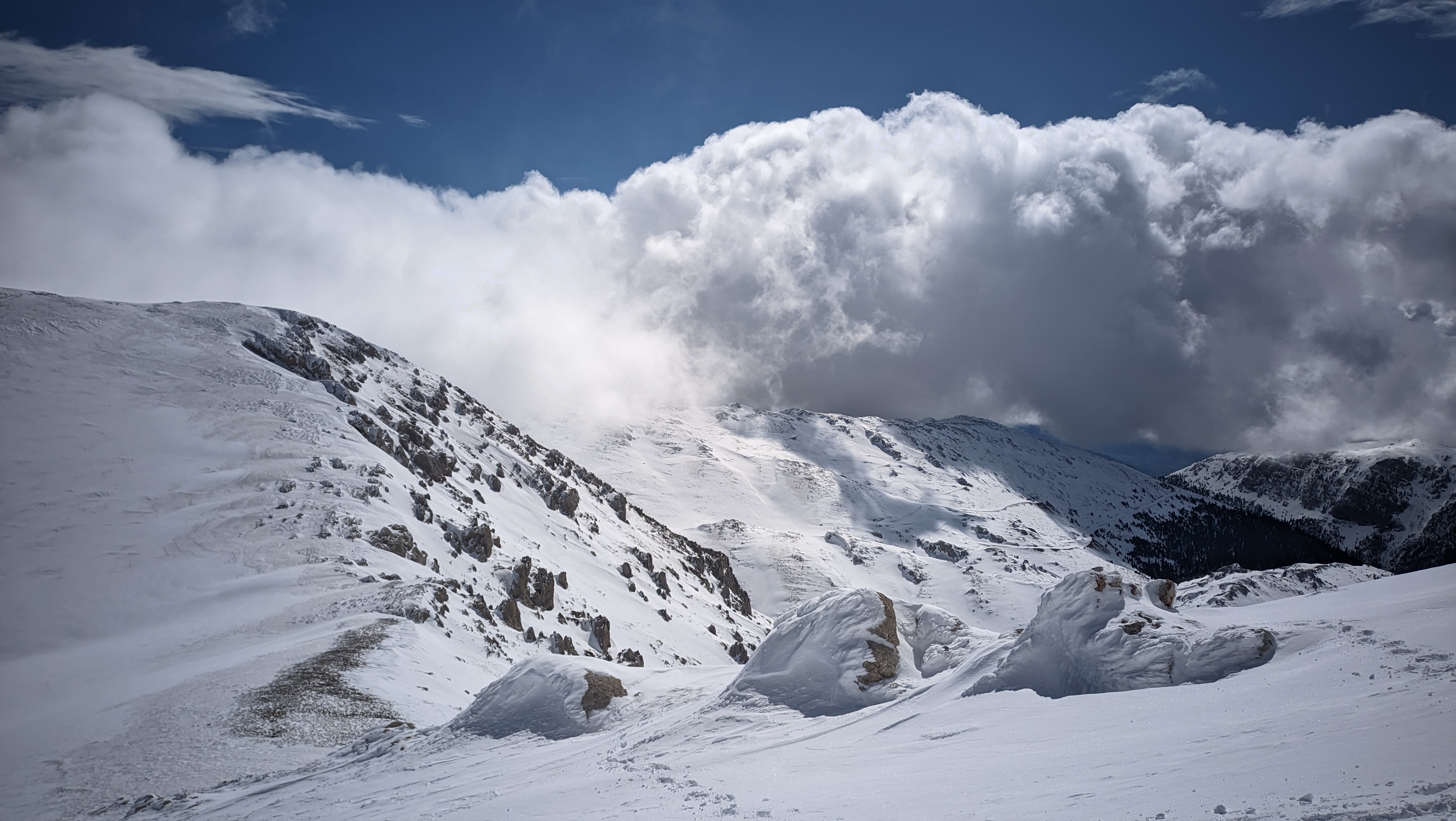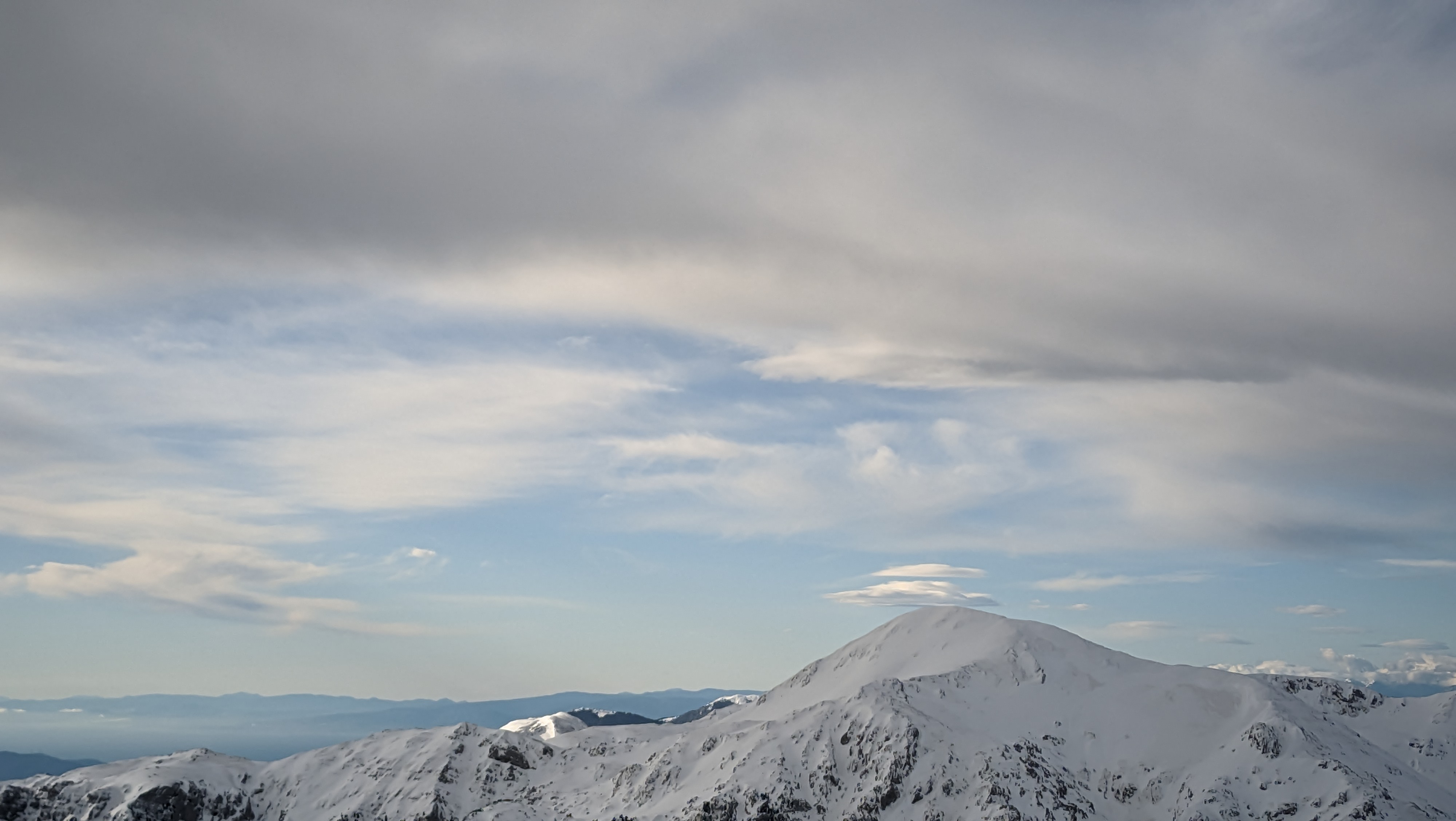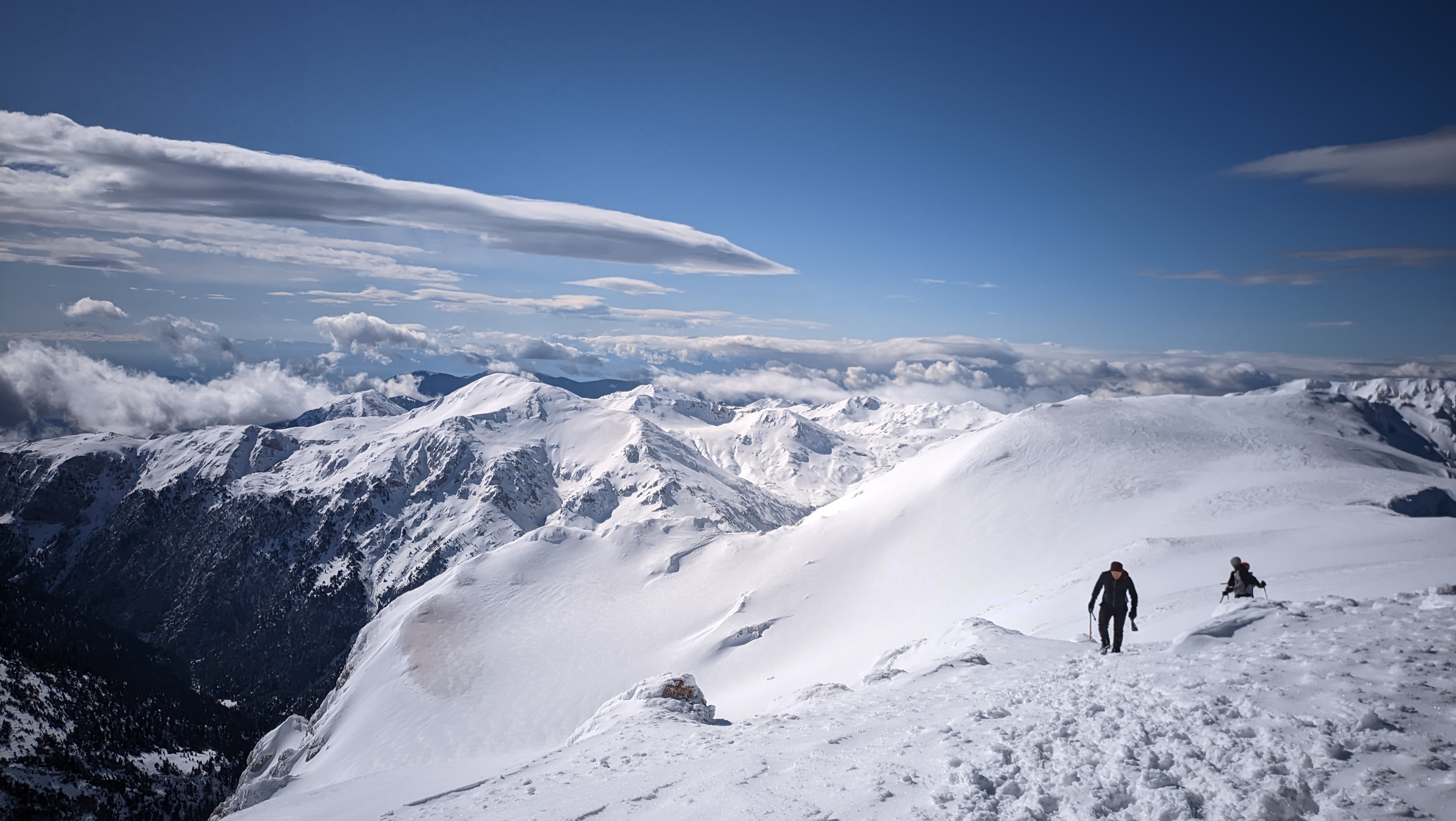 Thankfully, the fresh snow was nice and compact. The slope was a bit sharp at times, but we stayed close to the rock formations and hiked up leaning a bit towards the left. Looking back, a clear view all the way to the sea and the peaks of the Peloponnese at the opposite shore, helped a lot with in keeping morale up. With Platyvouna (translates as Miss Wide Mountain) on our right, easily distinguishable by its wide profile, we turned left and continued straight up towards the summit, the Pyramid of Giona. The snow was pretty deep, but we could still make relatively-sturdy steps with the crampon. Oh, how much easier it felt to hike up with such conditions! Last May, I was sweating like a horse, wearing my thighs out, as I was trying to reach the top. This time, the snow was levelling the slope, while keeping me cool and fresh despite the effort.