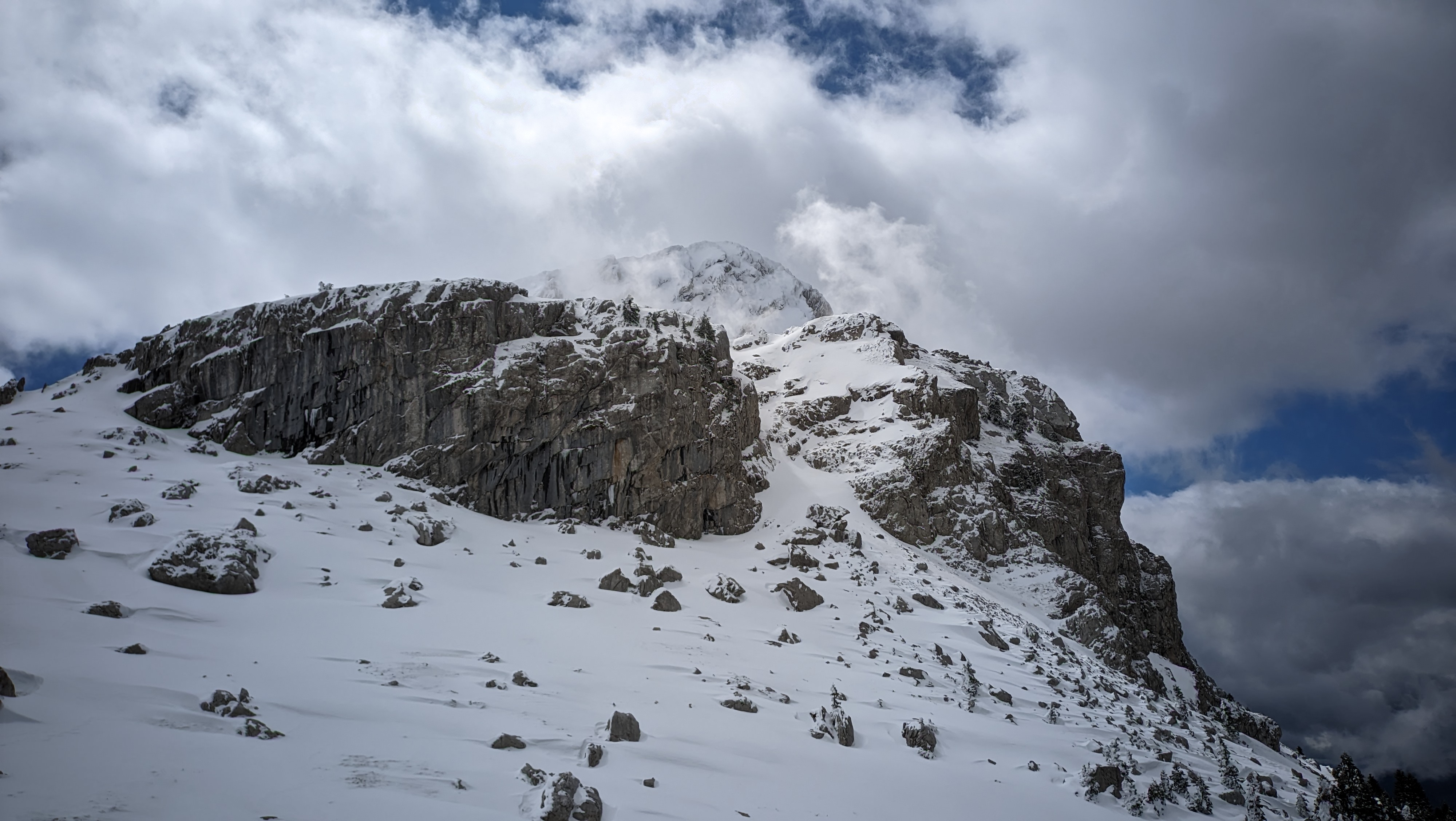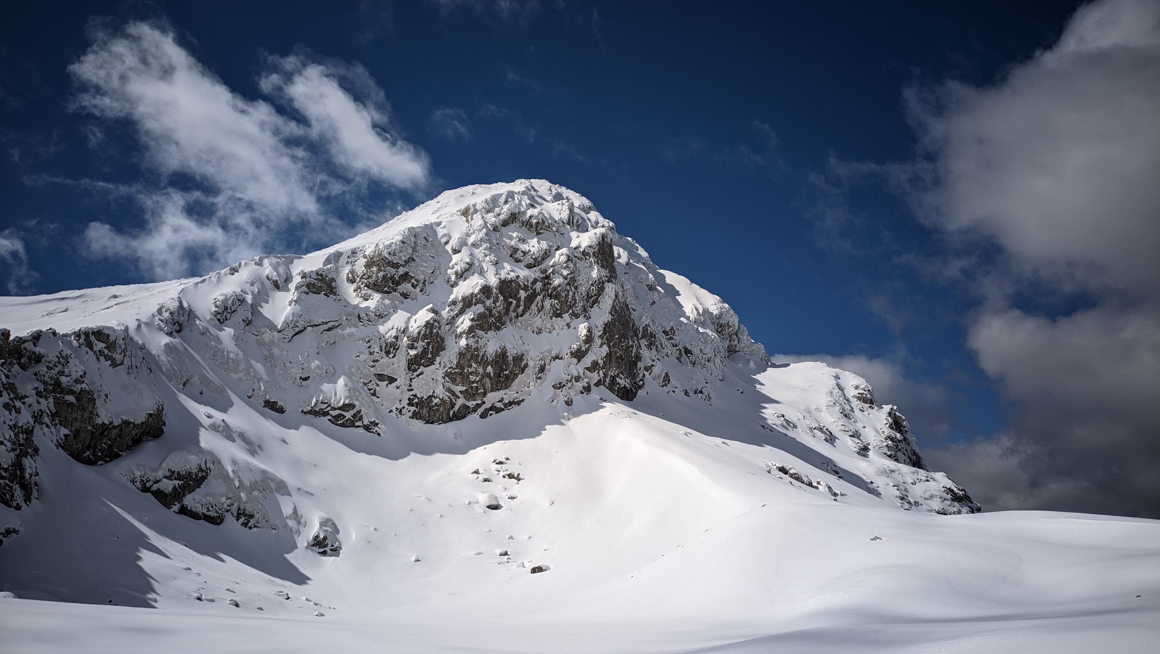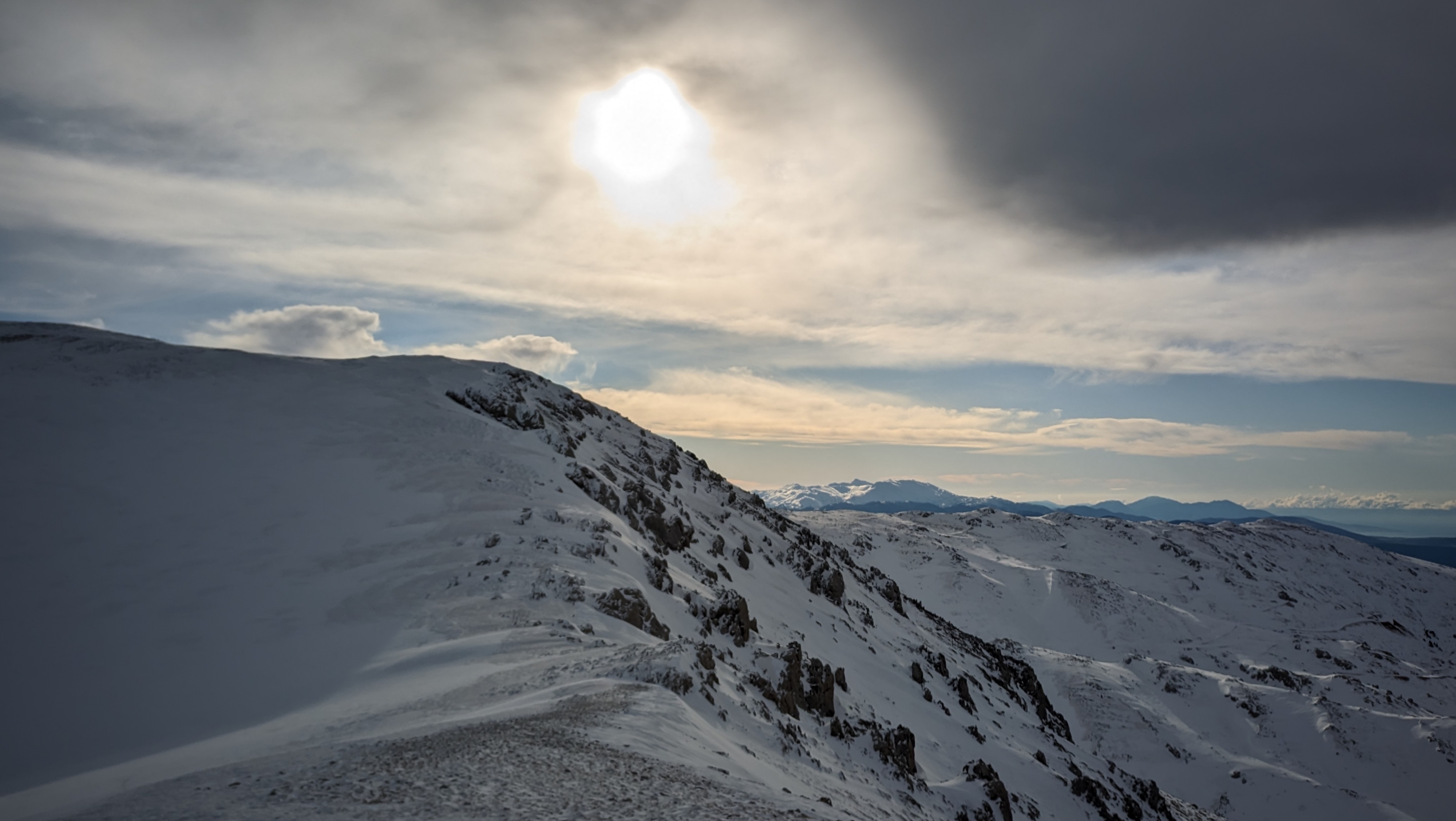 Thankfully, the fresh snow was nice and compact. The slope was a bit sharp at times, but we stayed close to the rock formations and hiked up leaning a bit towards the left. Looking back, a clear view all the way to the sea and the peaks of the Peloponnese at the opposite shore, helped a lot with in keeping morale up. With Platyvouna (translates as Miss Wide Mountain) on our right, easily distinguishable by its wide profile, we turned left and continued straight up towards the summit, the Pyramid of Giona. The snow was pretty deep, but we could still make relatively-sturdy steps with the crampon. Oh, how much easier it felt to hike up with such conditions! Last May, I was sweating like a horse, wearing my thighs out, as I was trying to reach the top. This time, the snow was levelling the slope, while keeping me cool and fresh despite the effort.