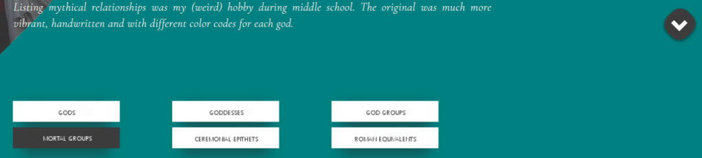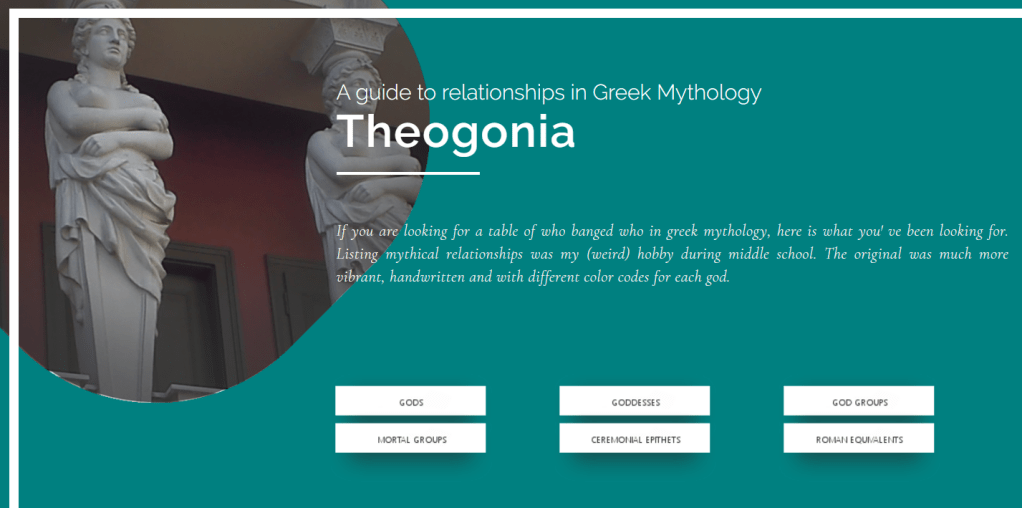 My hobby when I was in elementary school was to read the encyclopedia. I know, I know, too much free time! That is what happens when you grow up in a tiny village in the middle of nowhere. Back to the main topic, I didn’t read the entire encyclopedia, as even my childhood free time was finite. I read specifically all entries labeled as ‘Mythology’. After a while I realised that the family relationships are just too many and assumed the task of listing down the Olympian family tree as best as I could. I used hole punched paper, colored pens and a big folder with hole fasteners in order to extend the section for each god when it became too long to fit the page (especially true for Zeus and Poseidon). Eventually, I made lists of all gods and they’re relationships, children, ceremonial names, groups they belonged to, as well as groups of notable mortals. I continued my search towards other sources apart from our 30-book encyclopedia and expanded to Scandinavian, Roman, Egyptian and Hinduistic mythologies as well. At some point, I decided to input my handwritten forms into an excel file in order to be able to search more efficiently. Still, I kept the color coding for the names and groups.